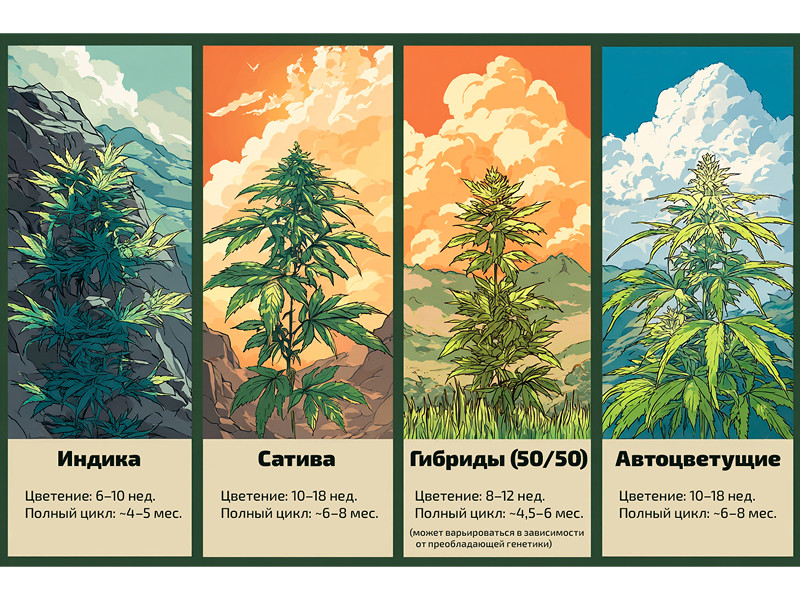 Чтобы максимально точно просчитать сколько времени растёт марихуана, нужно так или иначе заглянуть в описание конкретного сорта. Однако условно можно разделить все сорта на несколько типов по длительности созревания. Принадлежность к той или иной группе определяется схожим генетическим коктейлем.